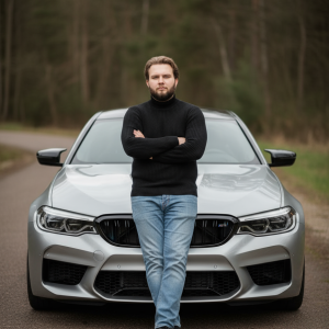 A man standing by a light gray audi A8L. Casual, contemporary style. Wearing a black turtleneck sweater, light wash blue jeans, and dark sneakers. Arms crossed over chest. Neutral facial expression, looking directly at the camera. Slight relaxed posture, leaning against car. Asphalt road, with muted colors of browns and grays. Blurred background of trees, suggesting a forest or woodland edge. Natural lighting, soft, diffused light. Close-up perspective, focusing on the subject and car. Composition centered around the subject. Contemporary realism style. Stylish, urban portrait with automotive element. Car in foreground, light gray color with dark accents. Focus on modern design and urban aesthetic. Subtle highlights and shadows. Overall mood is calm and understated. Natural background blurred.